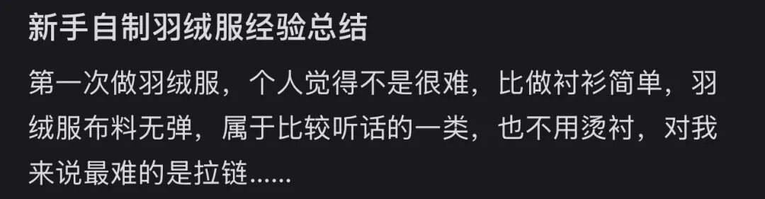 不知那些两周后在追评里疯狂吐槽自制羽绒服的朋友们,看到自己当初美滋滋展示成品的帖子时,会不会有种“山河破碎”的感觉: